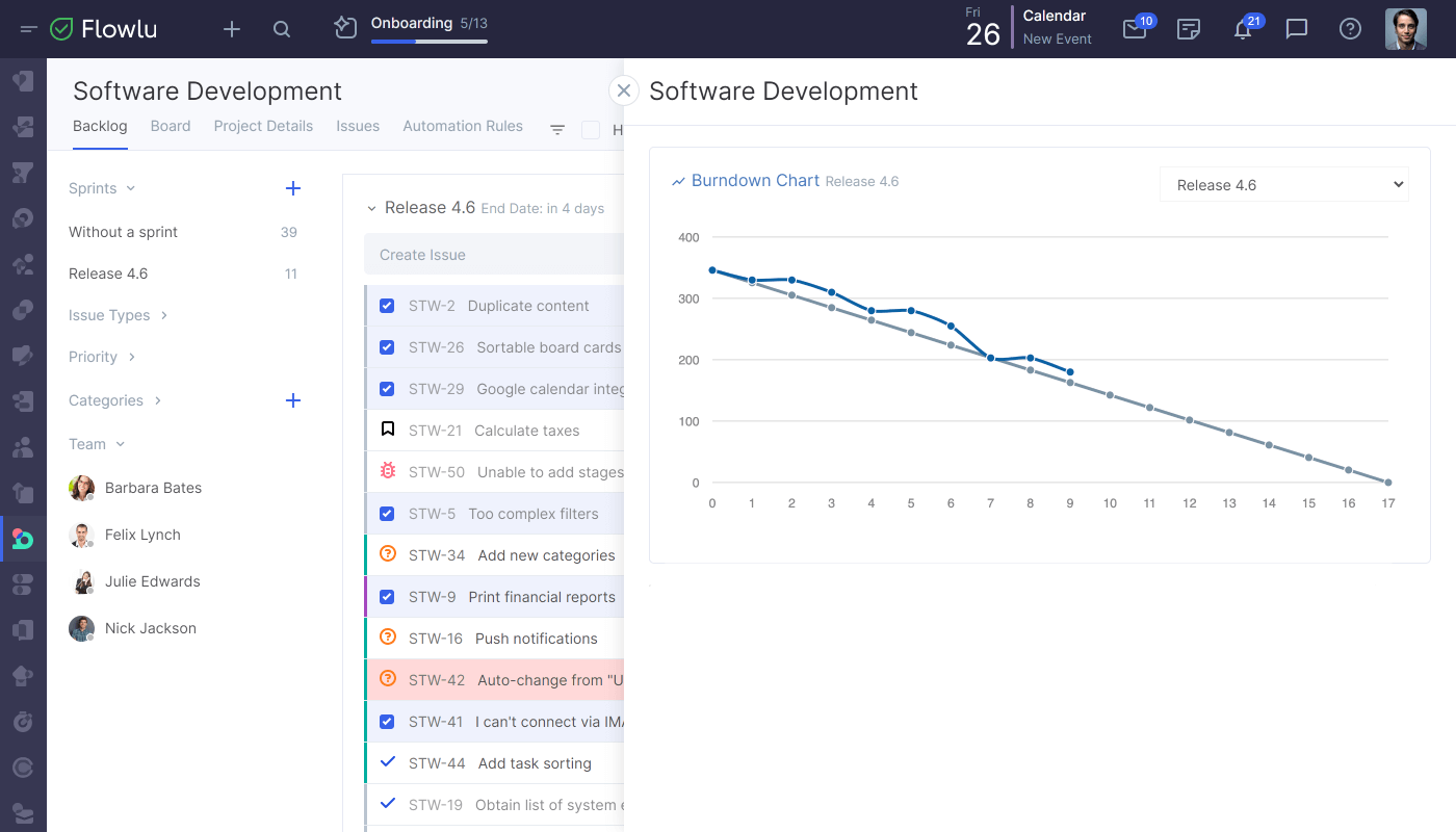 The report clearly displays how many story point should be completed every day and how many of them are completed in reality. Story points are recorded in the report when the issue moves to the last stage.
