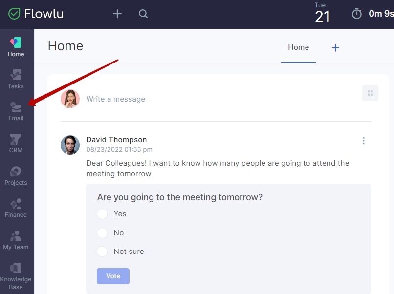 To set up an email integration, open the "Email" module in the Flowlu main menu. Please make sure the Email app is installed at your account.