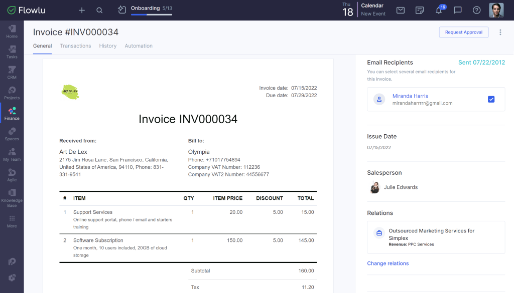 Como uma grande empresa, você deseja garantir que seus clientes paguem pontualmente. E com o Flowlu, isso é facilitado novamente. Afinal, com este sistema de CRM, você pode gerenciar todas as faturas facilmente. Você pode usar um dos muitos modelos disponíveis e personalizá-lo conforme necessário. Você pode adicionar taxas de envio, descontos ou impostos. Mas a melhor parte é que o Flowlu fará todos os cálculos para você.