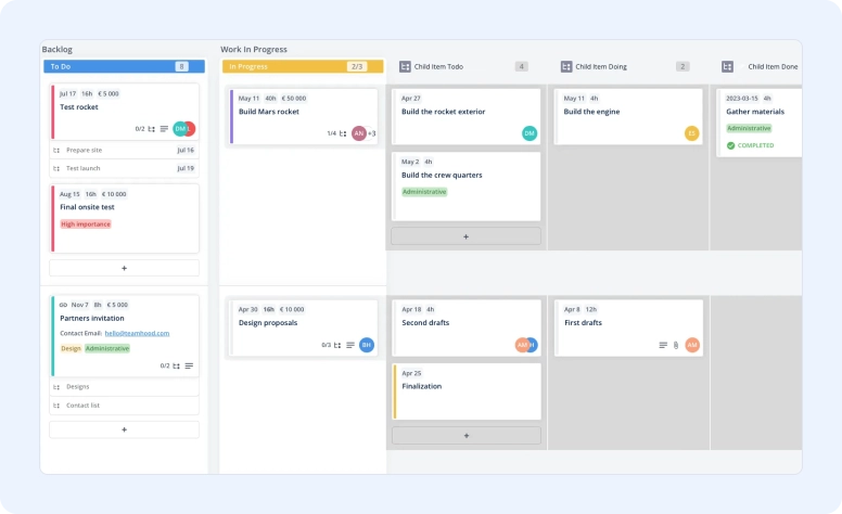 Teamhood é uma ferramenta poderosa de gestão de projetos Kanban para equipes de diversos setores e tamanhos. Ajuda com priorização de tarefas, rastreamento de desempenho e relatórios. Projetado com o quadro Kanban em mente, mas não exigindo que você siga a estrutura estritamente.