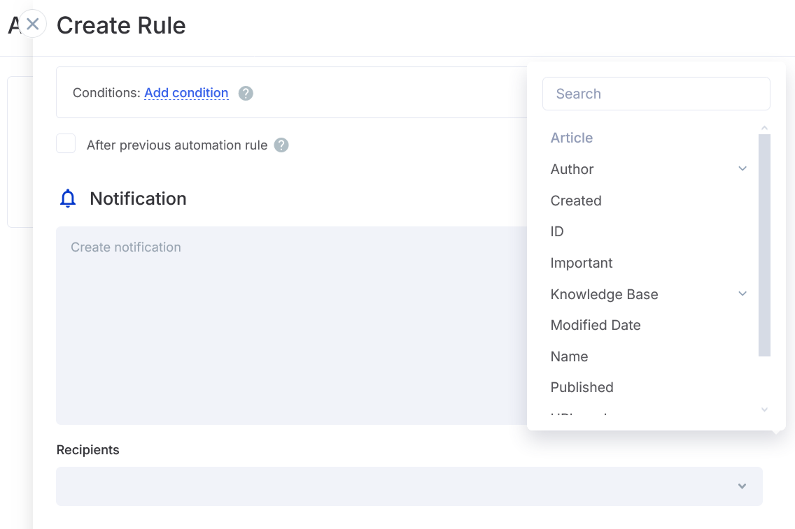 5. Adicione a condição que deve ser atendida para que sua regra continue sendo executada. Por exemplo, a notificação deve ser criada apenas se o artigo for marcado como importante.