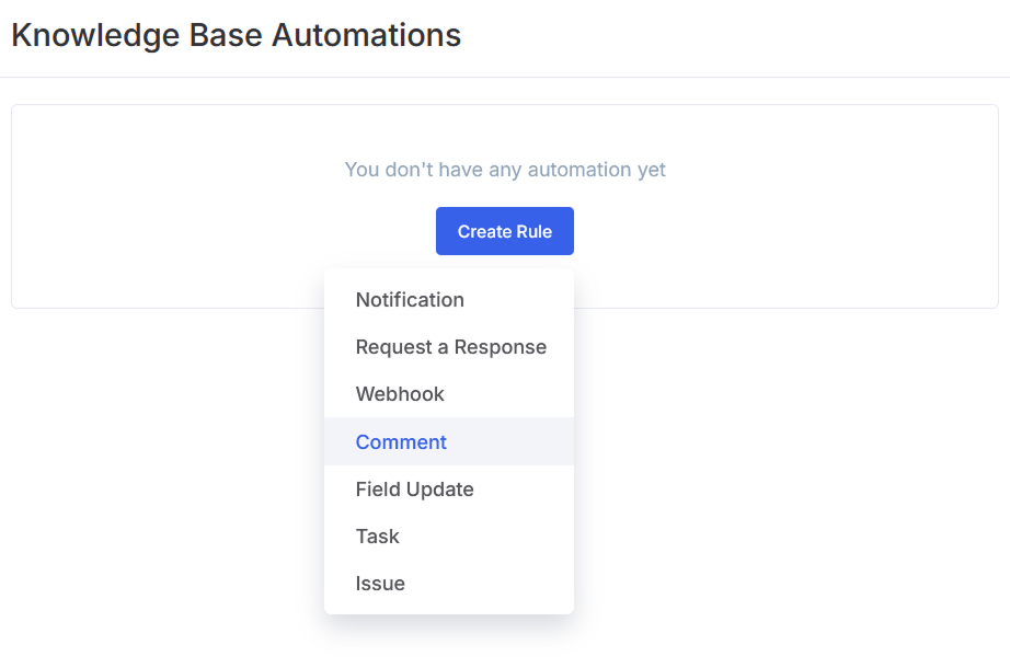 Observe que, para criar comentários automaticamente, eles devem estar habilitados nas configurações de cada base de conhecimento individual. Para habilitar comentários, vá para qualquer uma de suas bases de conhecimento, clique no botão de três pontos e vá para as configurações. Nas configurações da base de conhecimento → Principal, encontre o campo Comentário e preencha a marca de seleção "Usuários podem comentar em artigos".