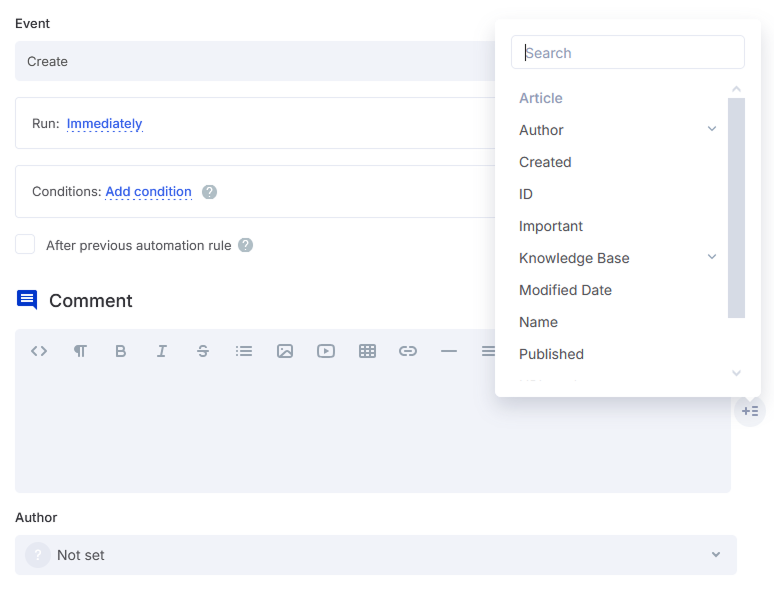 7. Adicione o conteúdo de um comentário. Clicando no botão de três pontos, você pode aplicar automaticamente variáveis da base de conhecimento.