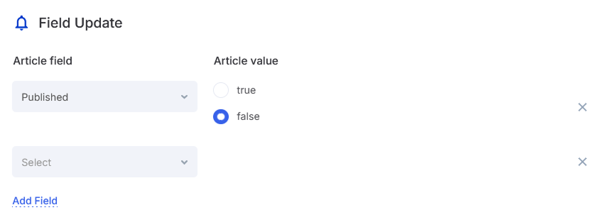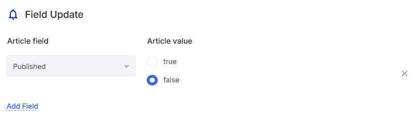 7. Escolha o campo que precisa ser atualizado e defina um novo valor para ele. Por exemplo, quando um artigo é atualizado, você pode alterar o campo "Publicado" para falso, para que o artigo seja automaticamente despublicado até a revisão.