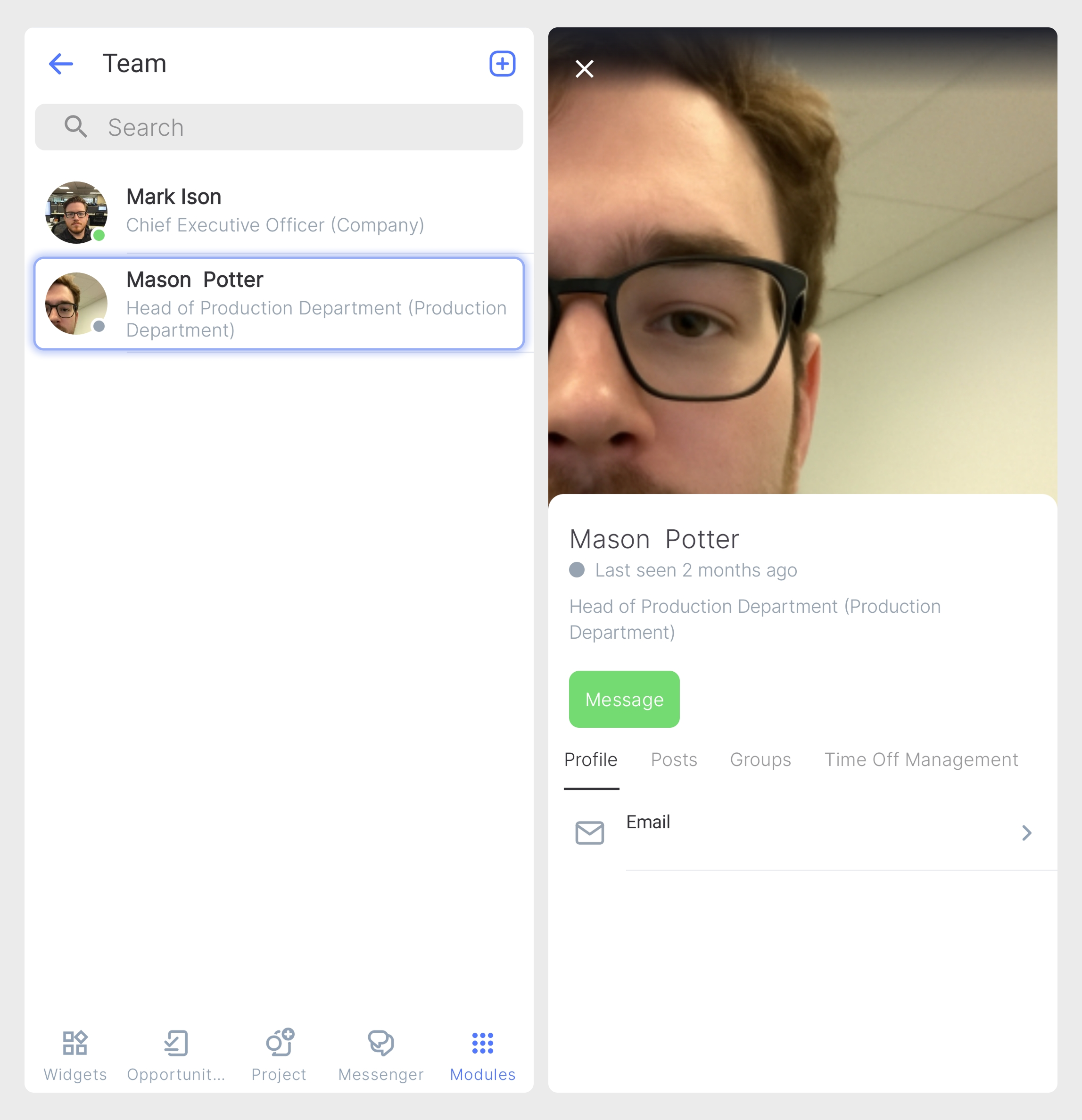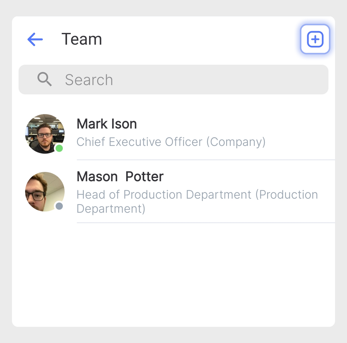 Na lista da Equipe, toque no nome da pessoa que deseja visualizar. Isso abrirá o cartão de perfil, que exibe: