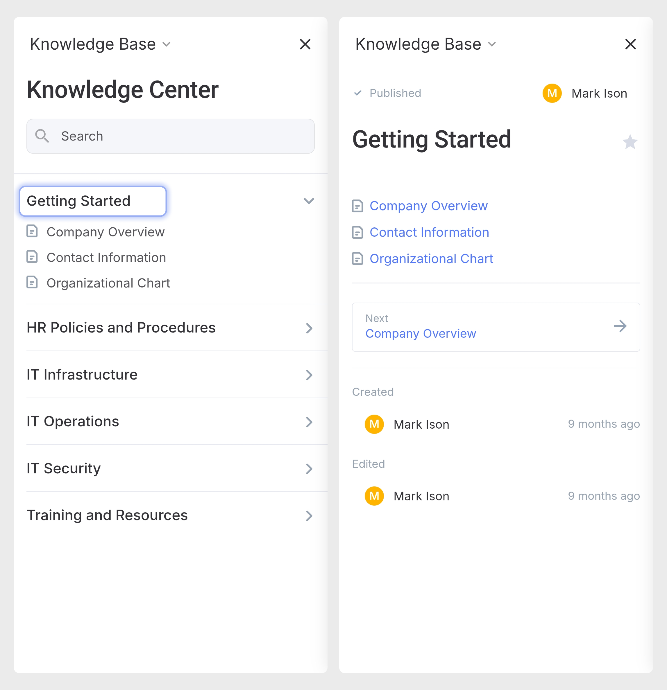 Ao abrir uma base de conhecimento específica, você pode navegar facilmente pelo seu conteúdo.