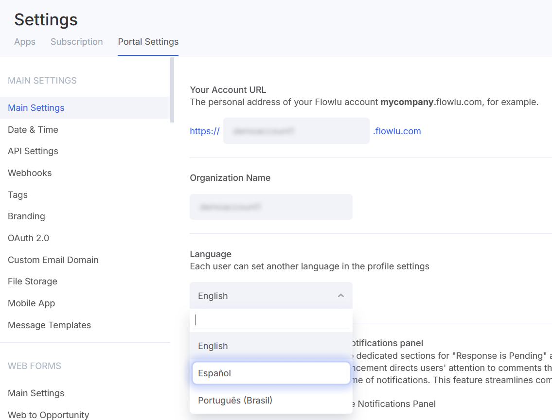 O Flowlu oferece suporte a vários idiomas para proporcionar uma experiência mais confortável e intuitiva para usuários em todo o mundo. Você pode definir o idioma da interface de duas maneiras: para todo o portal ou individualmente para sua conta de usuário.