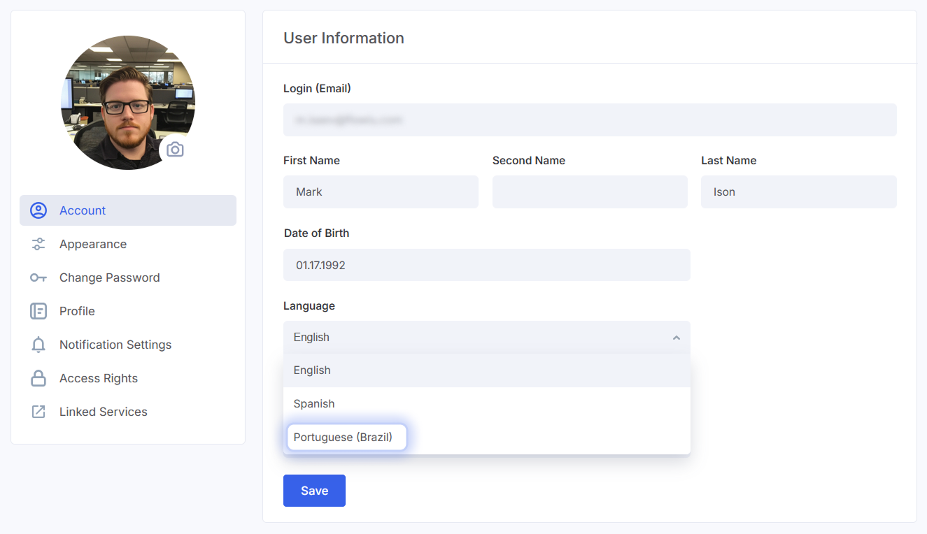 Cada usuário individual pode definir seu próprio idioma de preferência. Esta configuração se aplicará apenas à sua interface pessoal do Flowlu e substituirá a configuração de idioma padrão do portal. Qualquer usuário pode alterar o idioma do seu próprio perfil.