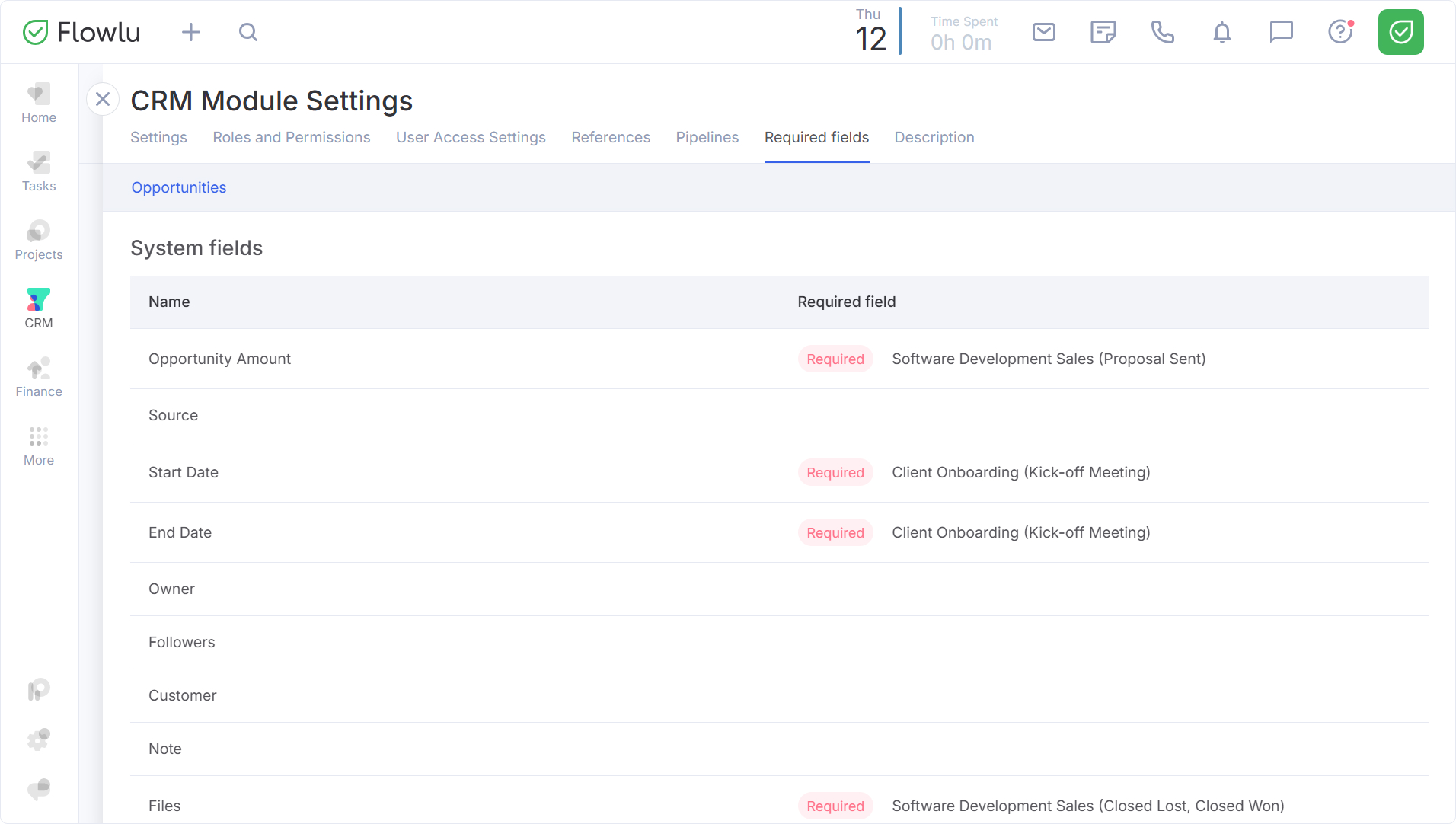 Nota: A funcionalidade de campos obrigatórios específicos por etapa está disponível apenas nos planos de assinatura premium do Flowlu (exceto no antigo plano Team).