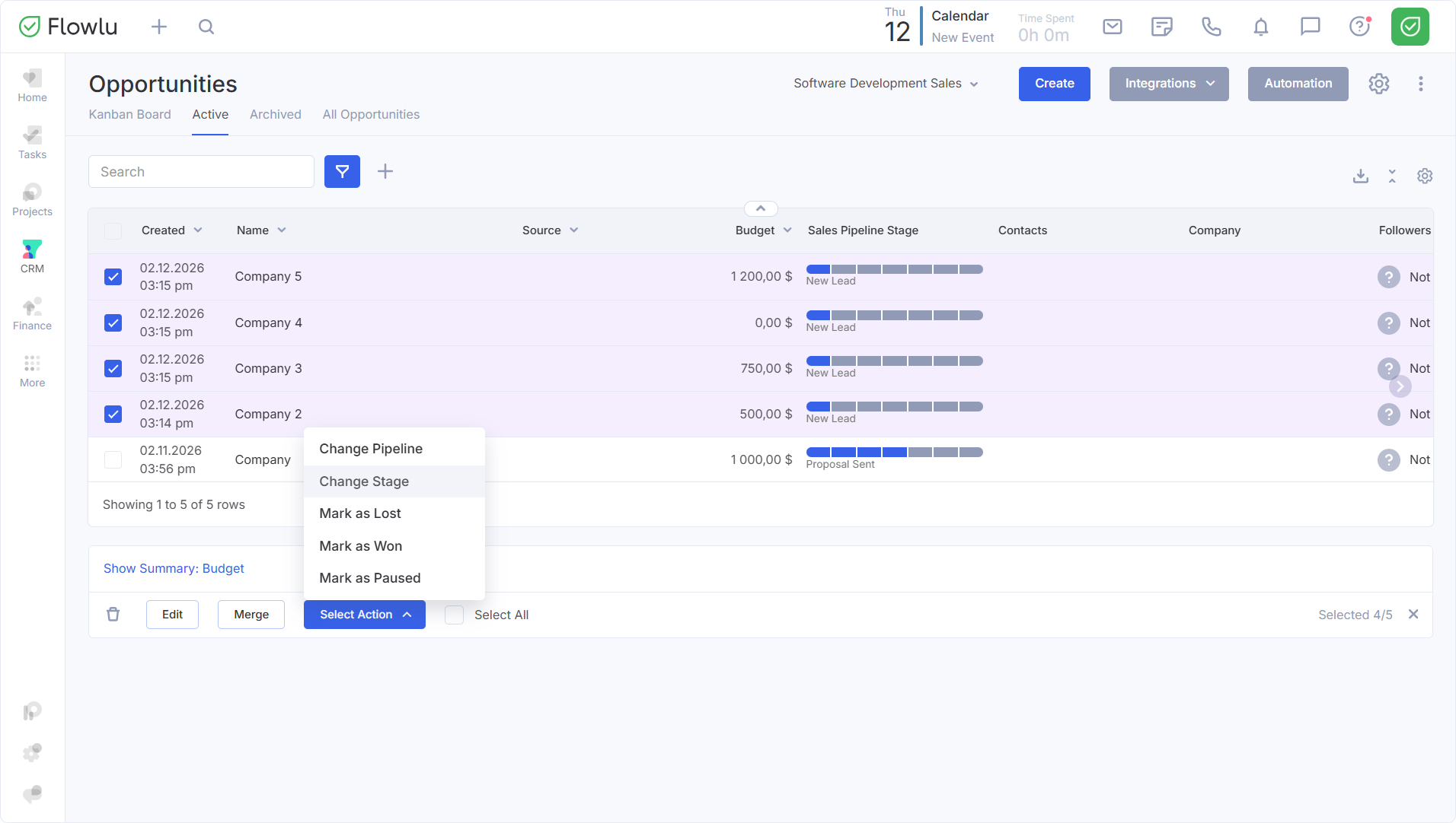 O sistema também impõe a validação durante ações em massa. Se você selecionar várias oportunidades para movê-las para uma nova etapa, o Flowlu verificará cada uma delas em busca dos dados obrigatórios.