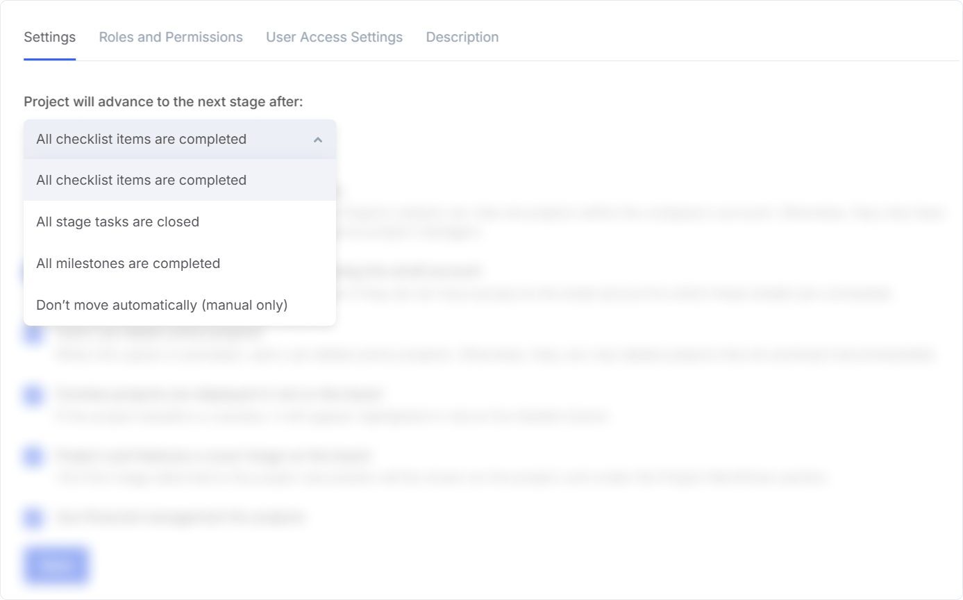 Esta opção ajuda os gerentes a economizar tempo. O projeto avançará automaticamente para as próxima etapa com base em condições selecionadas. Você pode escolher as condições de transição ou desativar este recurso no seletor:
