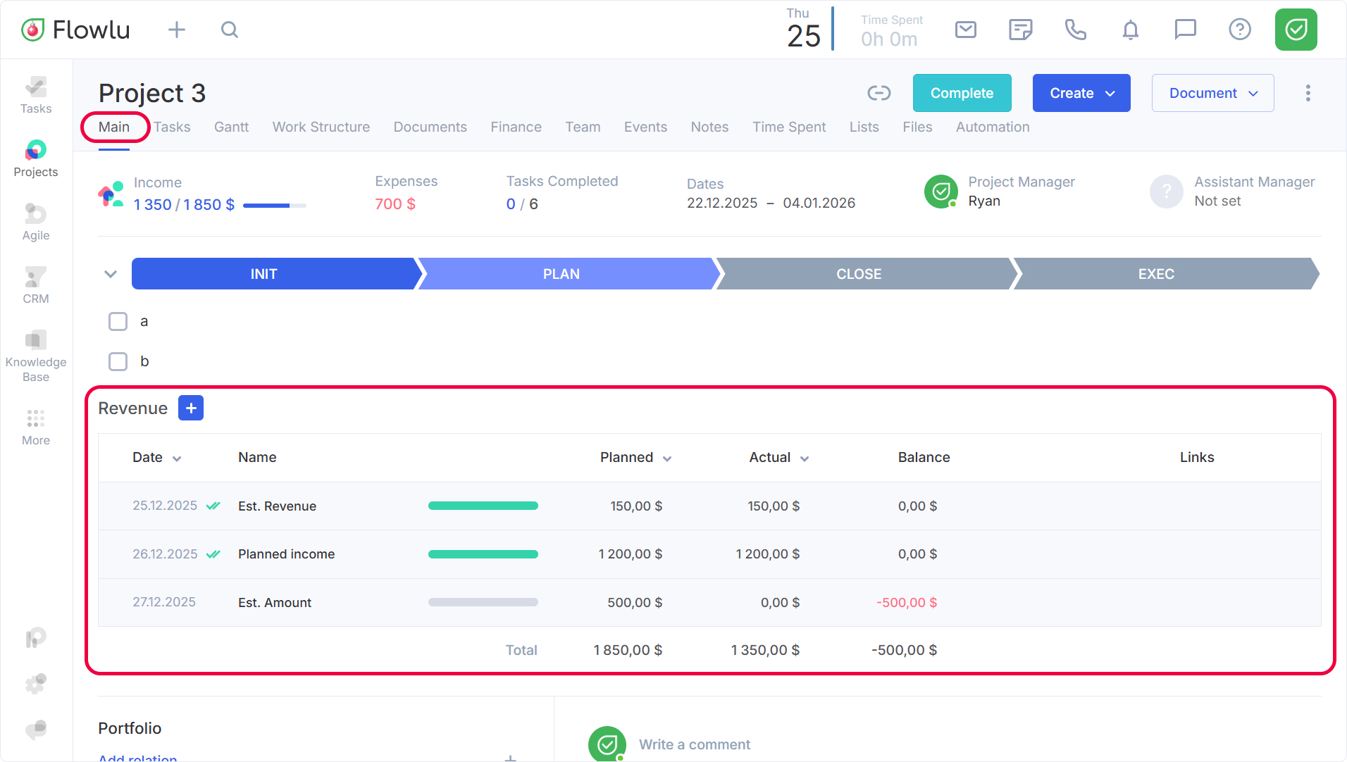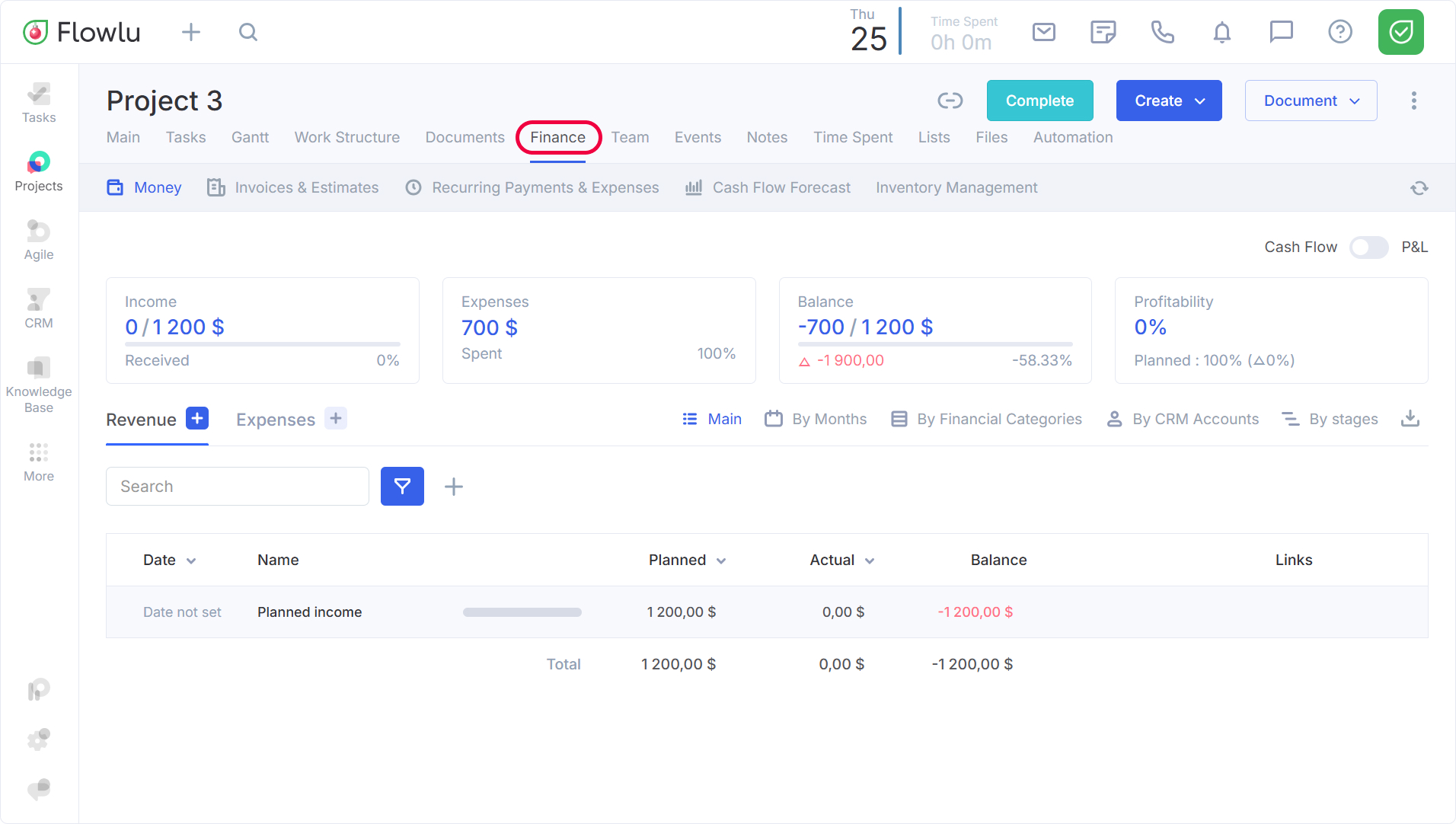 Quando ativado, o módulo "Projetos" é vinculado ao módulo "Financeiro". Você poderá acompanhar dados financeiros diretamente dentro do projeto, especificamente criando receitas e despesas previstas.