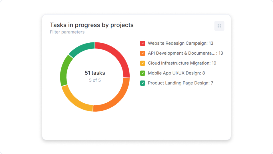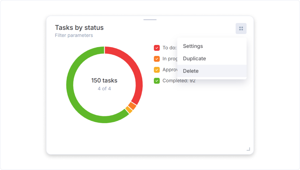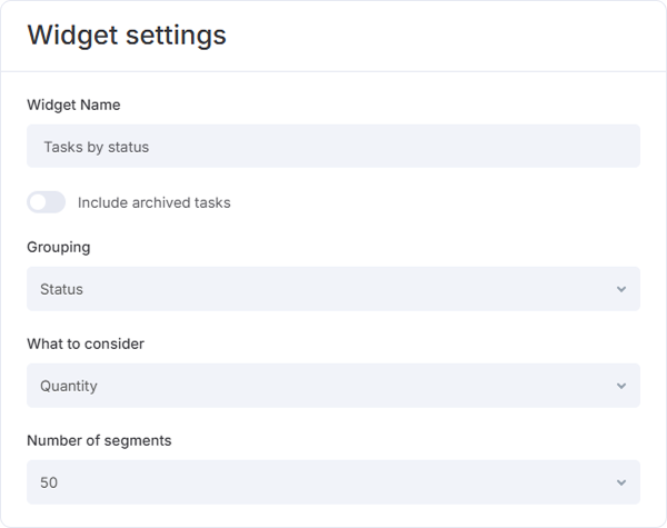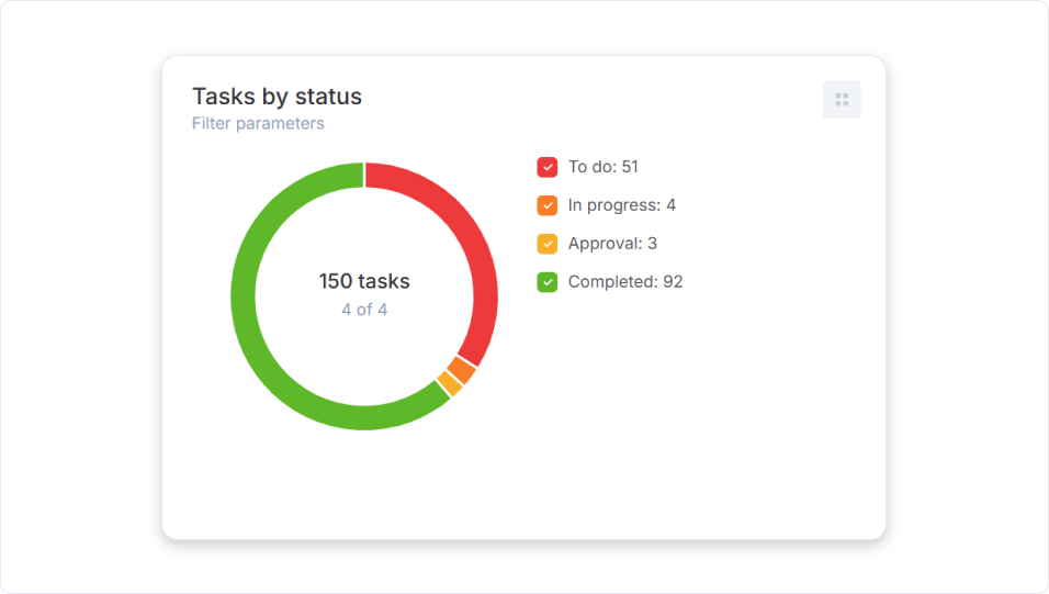 O Gráfico de rosca é um widget universal que exibe informações de tarefas na forma de um diagrama circular. A principal característica deste widget é que os dados no gráfico podem ser personalizados manualmente.