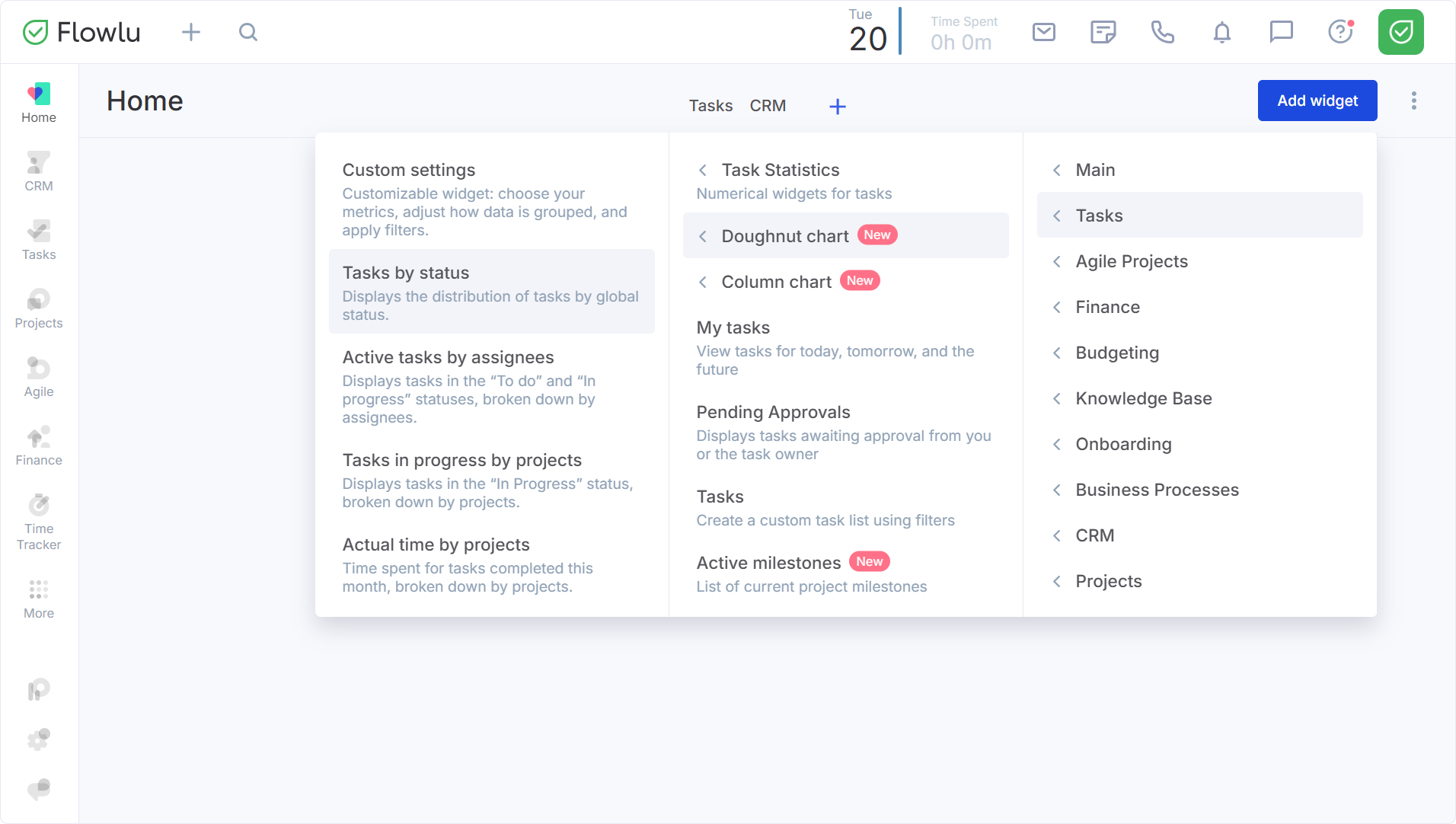 - Tipo de dados: escolha o que o widget irá calcular: quantidade (número de tarefas), tempo gasto ou tempo estimado.
