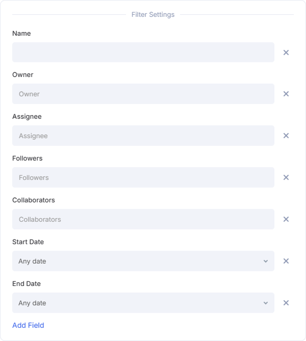 - Campos Personalizados: Use o botão Adicionar Campo para filtrar por qualquer outro parâmetro de tarefa disponível.