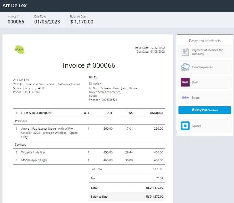 Para realizar um pagamento de teste, crie uma fatura da organização especificada nas configurações do método de pagamento e selecione a conta do cliente.