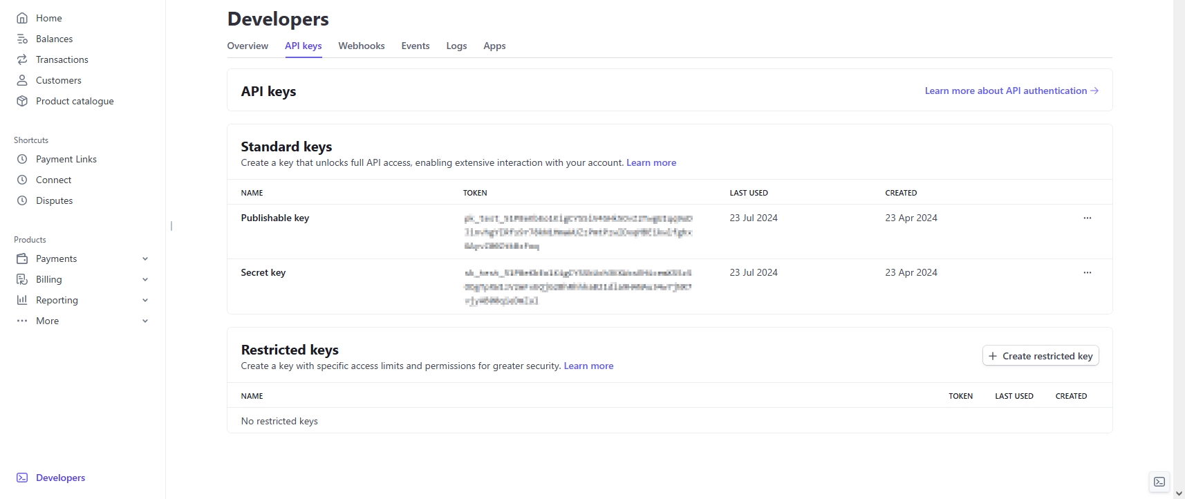 Na sua conta do Stripe, vá para Configurações -> Desenvolvedores -> Chaves de API e copie a Chave Secreta e a Chave Publicável.