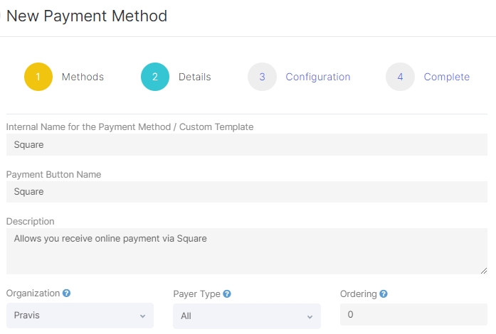 Especifique o nome do sistema do método de pagamento, por exemplo, Square, o nome do botão (que será exibido ao visualizar a fatura online) e, se necessário, a descrição do método de pagamento como uma explicação para os usuários do seu portal.