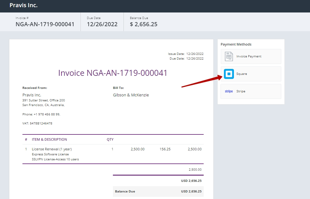 Copie o link externo e siga-o. Na fatura, o botão Square aparecerá, usando o qual você pode fazer um pagamento de teste.
