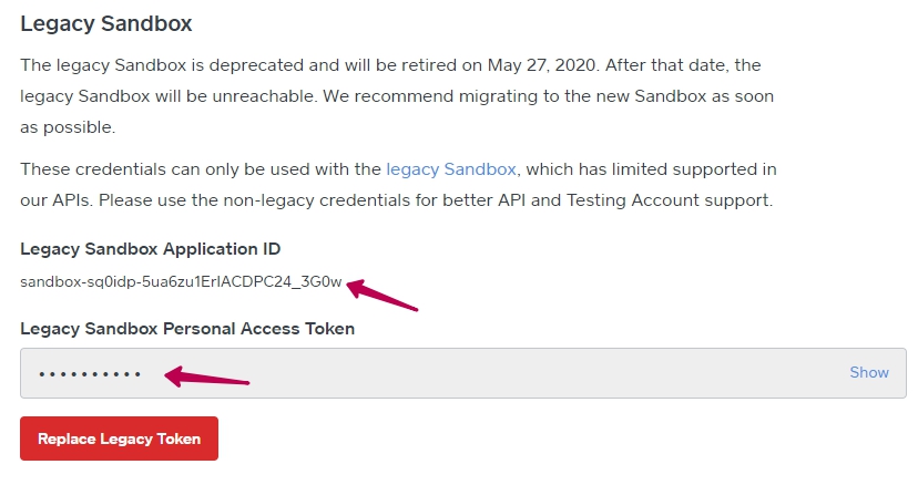 Você será redirecionado para a guia Credenciais. Pressione Ver credenciais do sandbox legado na guia Sandbox Legado e copie ID do Aplicativo Sandbox Legado e Token de Acesso Pessoal Sandbox Legado nos modos.