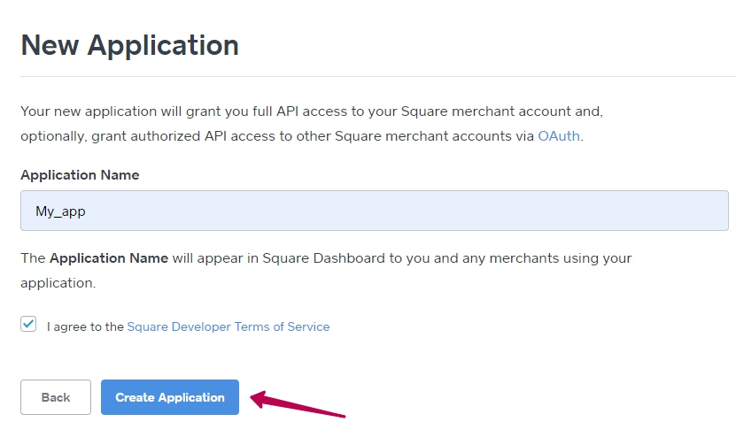 Insira o nome do seu novo aplicativo, concorde com os Termos de Uso do Square e clique em Criar Aplicativo.