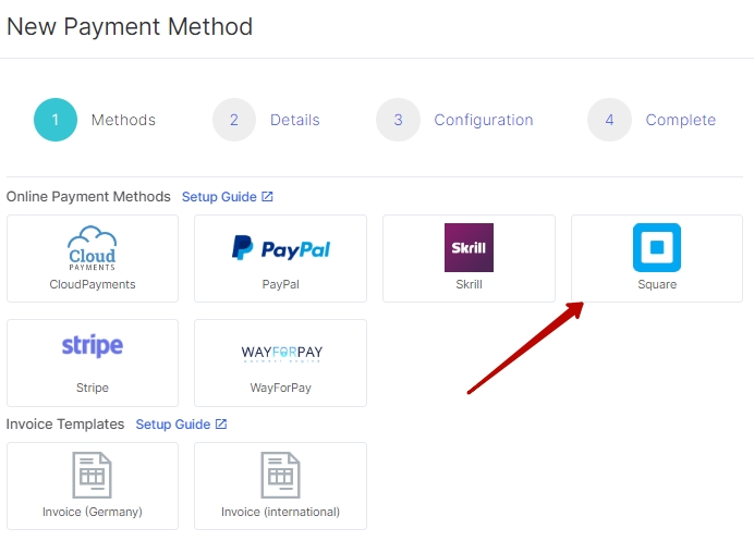 Vá para Configurações do sistema → Finanças → Métodos de Pagamento e Modelos e clique no botão Criar. No formulário aberto, selecione a opção Square.