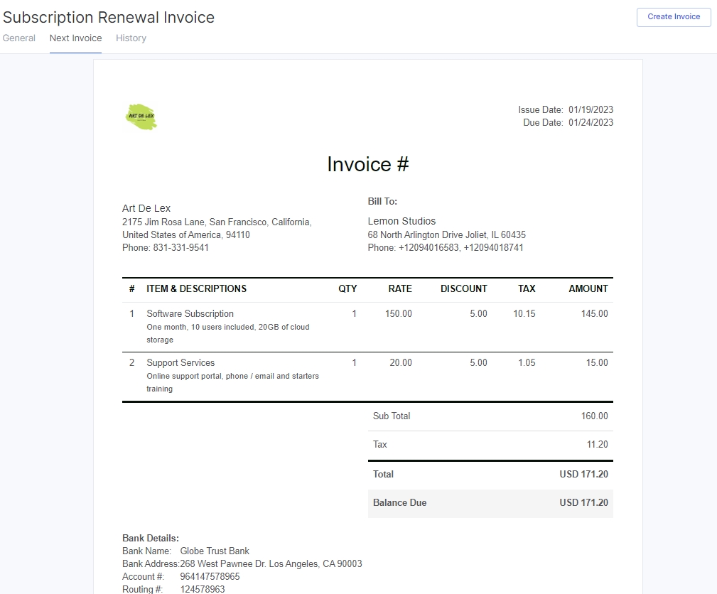 A área principal desta guia compreende a lista de faturas que foram criadas com base nesta fatura recorrente. Na guia Próxima Fatura, você pode ver a próxima fatura que será criada de acordo com esta fatura recorrente e sua data (o número da fatura não é indicado, porque não é conhecido quantas faturas serão criadas durante o período de recorrência).