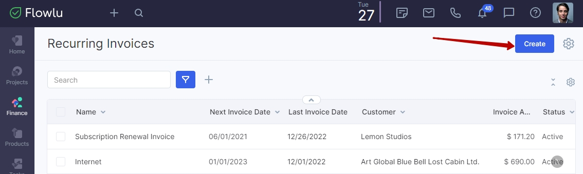 Se esta seção não for exibida, vá para Configurações do Portal -> Finanças -> Configurações Principais e marque a opção Usar Faturas Recorrentes. Além disso, se você quiser permitir que funcionários que não têm acesso de Administrador às Finanças criem essas faturas, marque a opção Permitir que usuários criem faturas recorrentes.