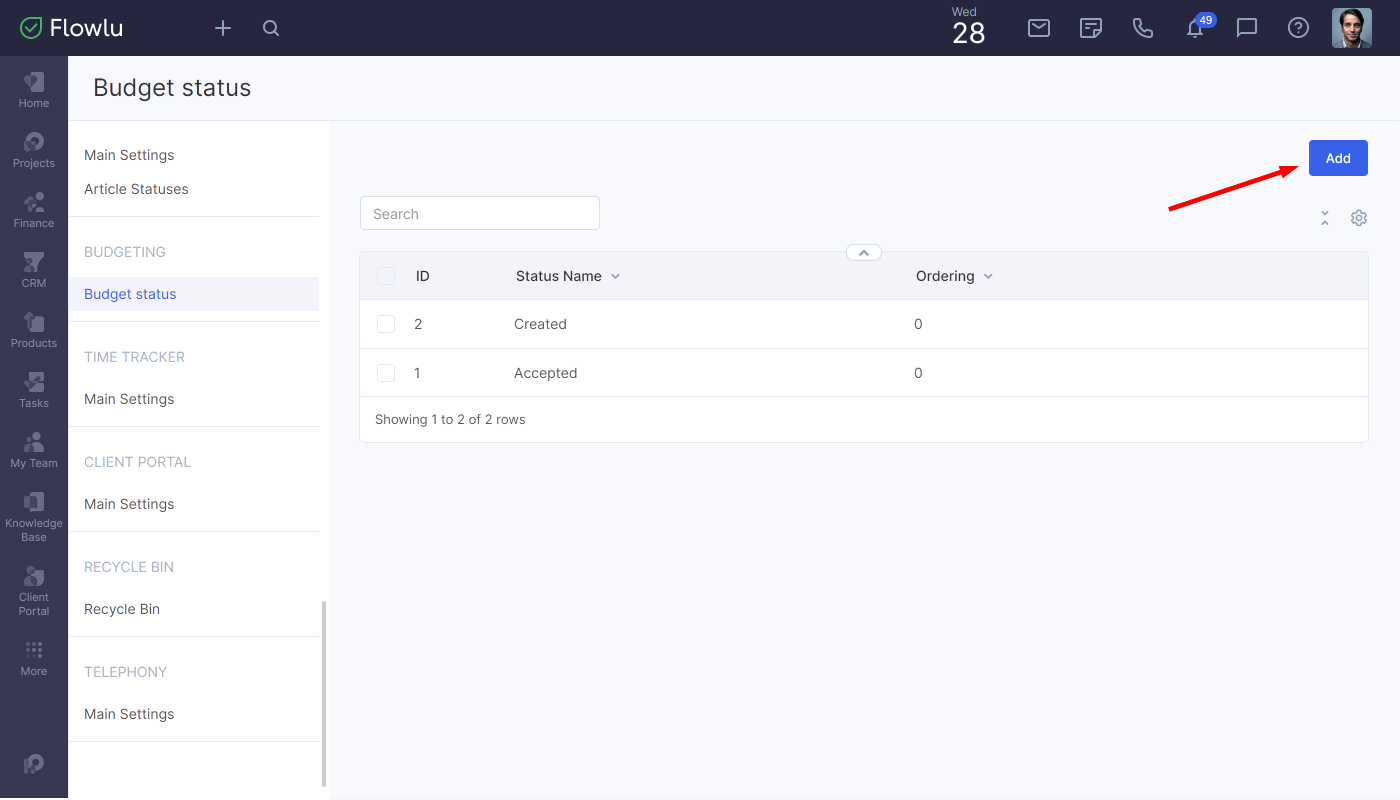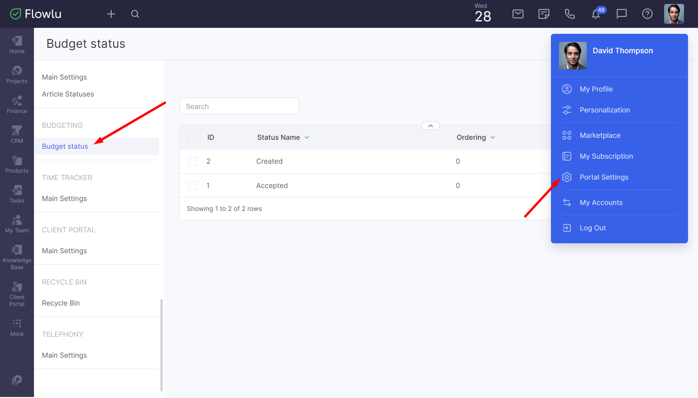 Você também pode criar seus próprios status personalizados para orçamentos. Para fazer isso, clique no seu ícone no canto superior direito e vá para as Configurações do Portal e encontre a guia Orçamentação.