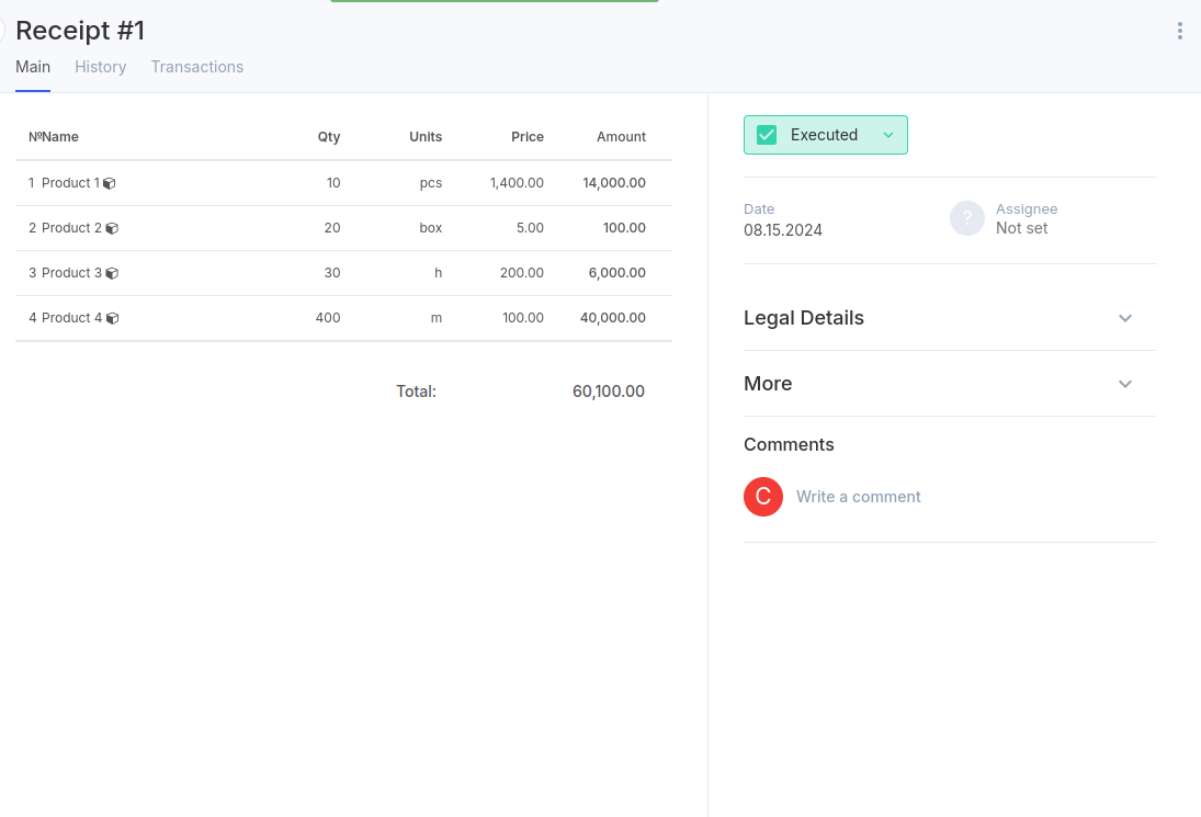 A aba "Principal" também mostra o status do documento. Observe que um documento com o status "Executado" não pode ser editado. Se você quiser fazer alterações, deve alterar o status para "Criado".