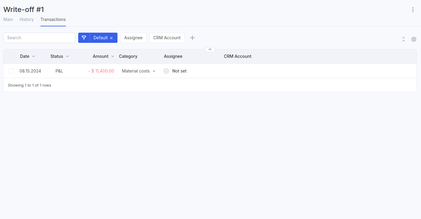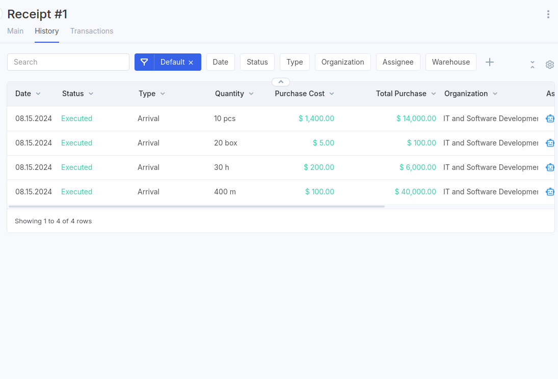 Aba Histórico: Esta seção exibe todos os registros de receitas e despesas relacionados ao documento de Armazém atual.