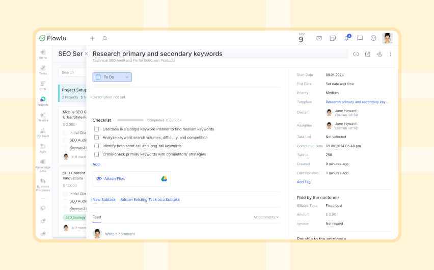 Inicie um Novo Projeto: Comece um novo projeto de SEO dentro do Flowlu inserindo detalhes como título do projeto, metas, palavras-chave alvo e informações do cliente.