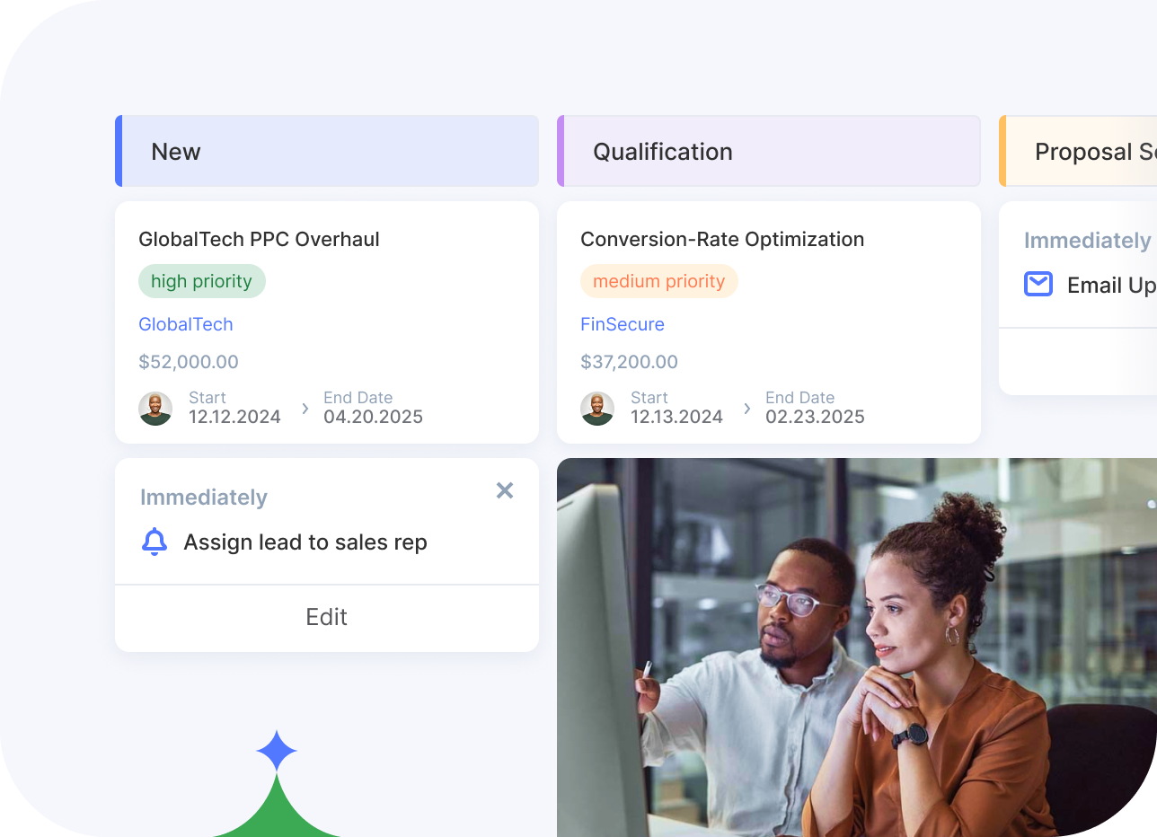 Para equipes em crescimento: vá além do básico das tarefas e gerencie clientes com confiança.