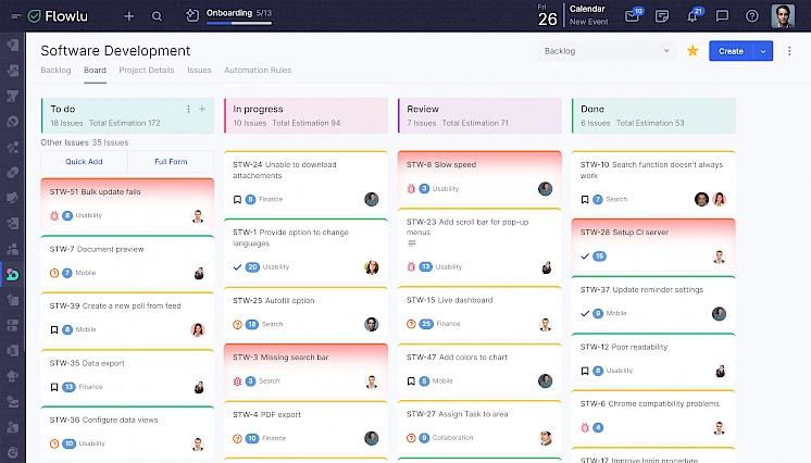 Flowlu’s Agile boards lets you visualize your workflow stages by columns. Always be able to see your work and know what stage everything is in. See what hasn’t been started, what is in progress, and what’s been finished and delivered.