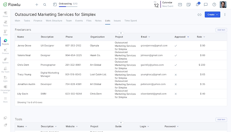 Generate custom lists with your own fields to handle any sort of information — contracts, passwords, equipment, etc. Utilize custom fields to log and manage vital data and quickly find the right information using filters and sorting.