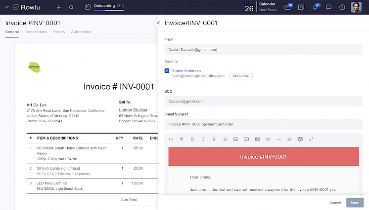 Be able to send your team the invoices they need immediately. With just a few clicks, you’ll have several options for sharing company invoices. Send invoices from Flowlu by email, get a direct link to them, or download them for offline storage.
