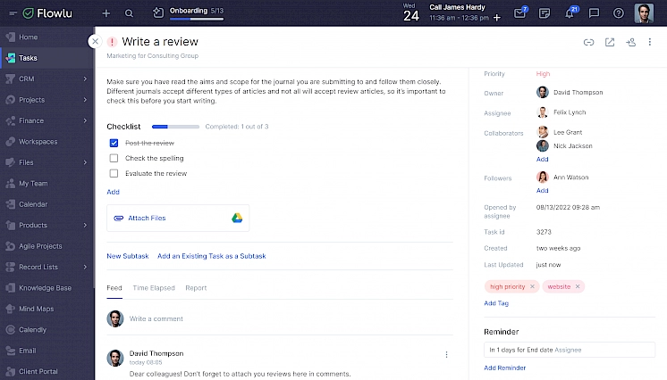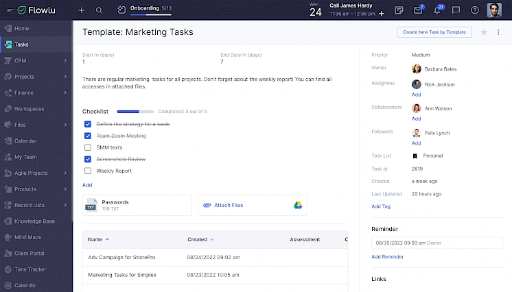 You are likely to assign similar tasks now and again. Instead of creating them from scratch, generate predefined templates and allocate common tasks at two clicks. Determine steps, select assignees and collaborators, add a PDF guideline and configure a reminder. Let Flowlu do the busy work for you!